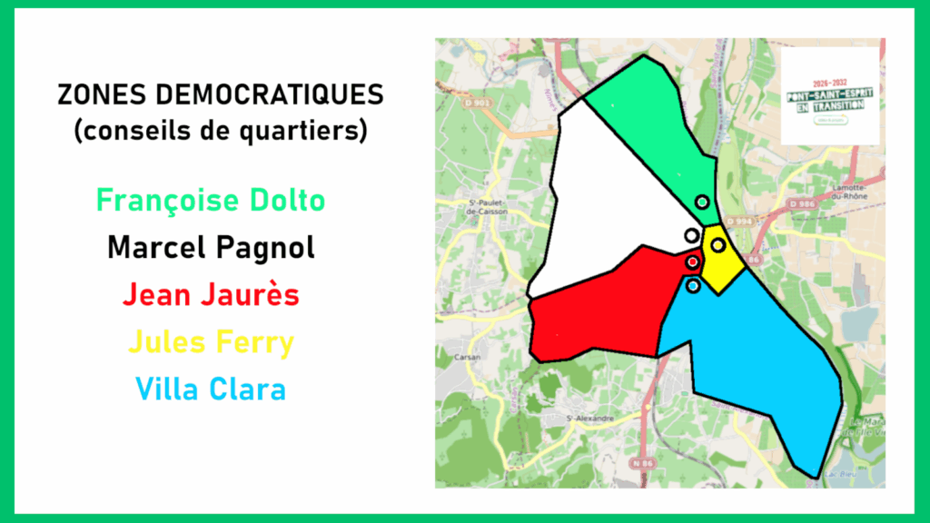 Citoyenneté et démocratie Mettre en place des conseils de quartier traitant des questions locales et se réunissant dans les écoles du premier degré Établir un fonctionnement municipal en adhocratie pour articuler les 5 conseils de quartier avec le conseil municipal Mettre en place une enveloppe indemnitaire globale pour indemniser tous les élus du conseil municipal (en cours de rédaction, cliquez pour plus d’informations) Introduire de la participation citoyenne Faire appel à des référendums locaux pour les sujets importants (en cours de rédaction, cliquez pour plus d’informations)
