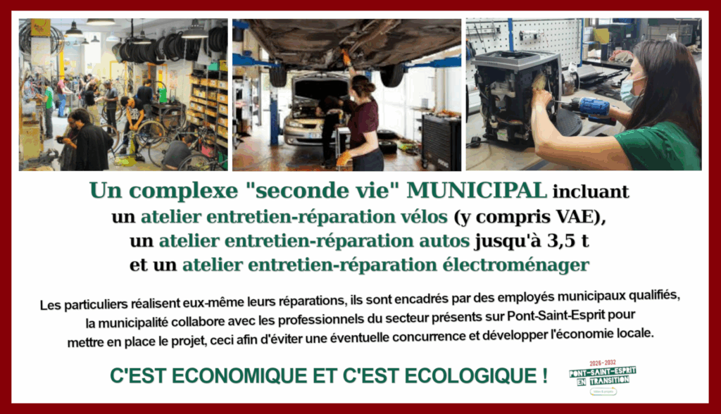 Un complexe seconde-vie municipal incluant un atelier entretien-réparation vélos, un atelier entretien-réparation autos et un atelier entretien-réparation électroménager
