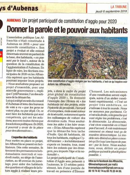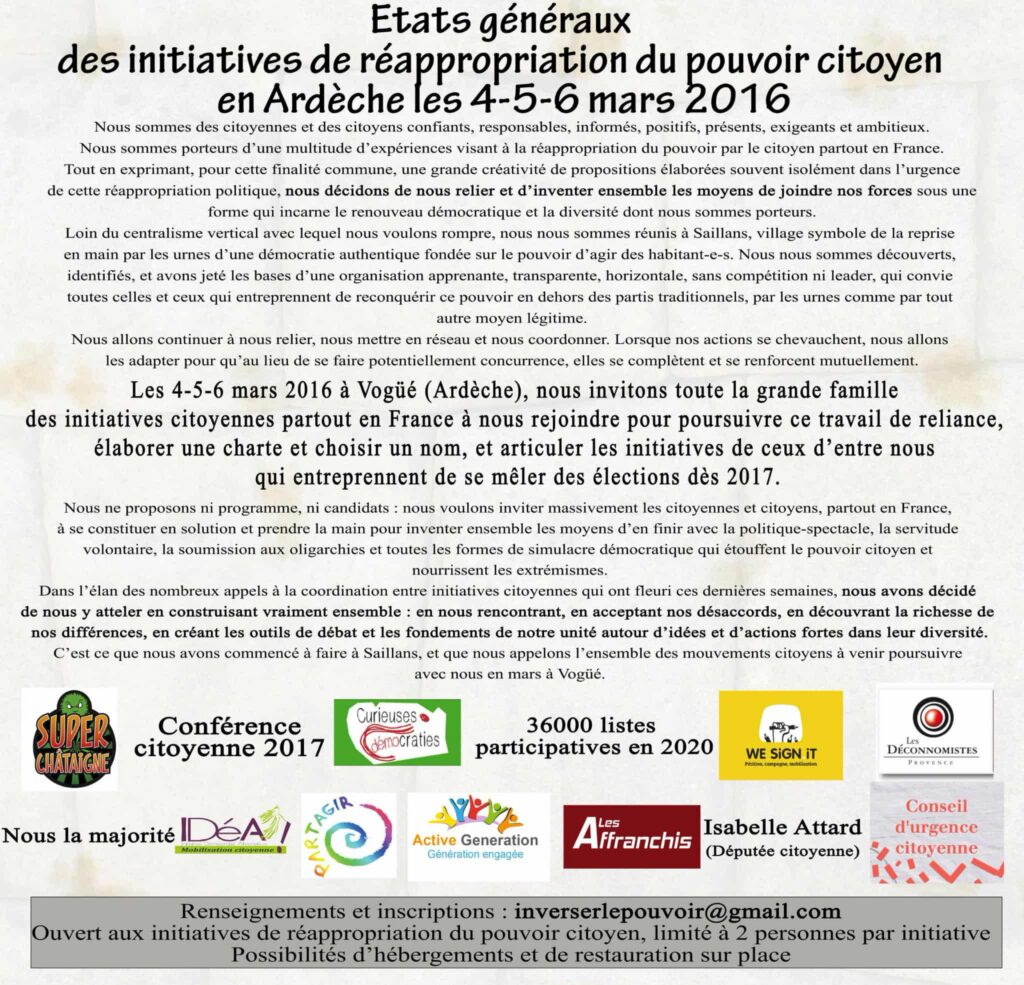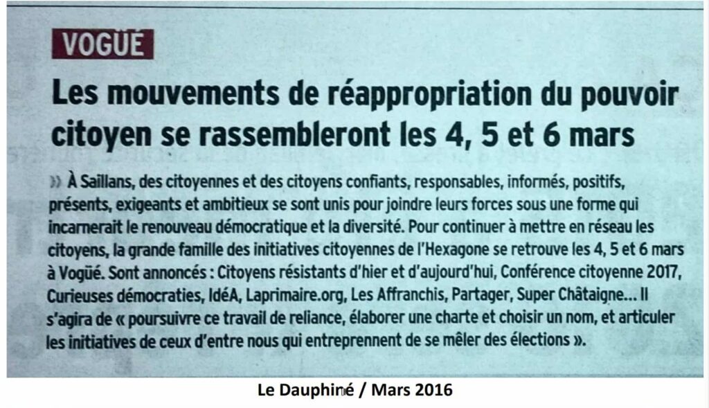 J’ai participé à créer l’association politique Les Affranchis en vue de promouvoir une candidature présidentielle pour une 6ème République (le justicier ardéchois Super Châtaigne). Au travers de cette dynamique, mon association a organisé, suite à une première rencontre à Saillans (26), les Etats généraux citoyens de Vogüé (07) qui ont débouché sur un réseau municipaliste français et un mouvement nommé Processus Vogüé puis La Belle Démocratie.