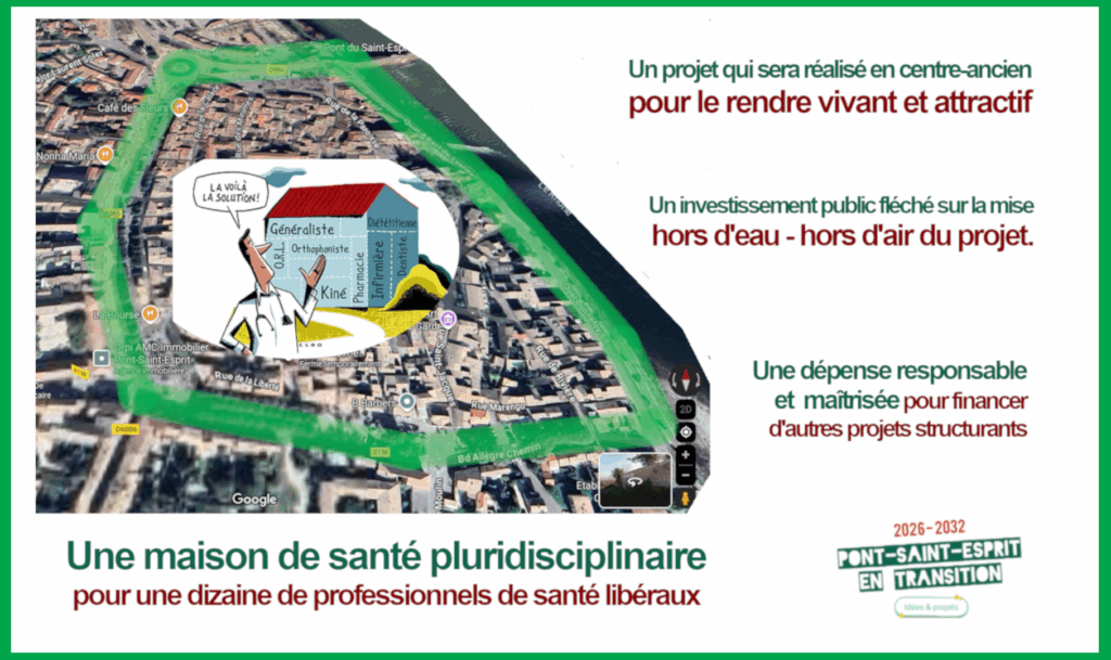 Pour redynamiser la ville de Pont-Saint-Esprit et y attirer de nouveaux habitants, le projet Pont-Saint-Esprit en transition 2026-2032 prévoit d’associer l’offre de soins du GIP Ma santé Ma région (médecins salariés par la Région Occitanie) à un projet destiné à des médecins libéraux (notamment généralistes).